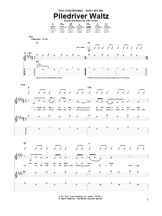 Download or print Arctic Monkeys Piledriver Waltz sheet music, chords and digital score arranged for Guitar Tab. This Alternative score includes 5 page(s).