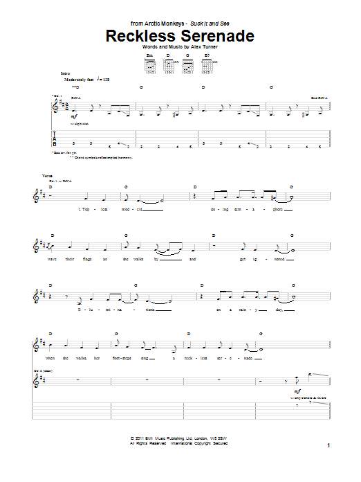 Download or print Arctic Monkeys Reckless Serenade sheet music, chords and digital score arranged for Guitar Tab. This Alternative score includes 5 page(s).