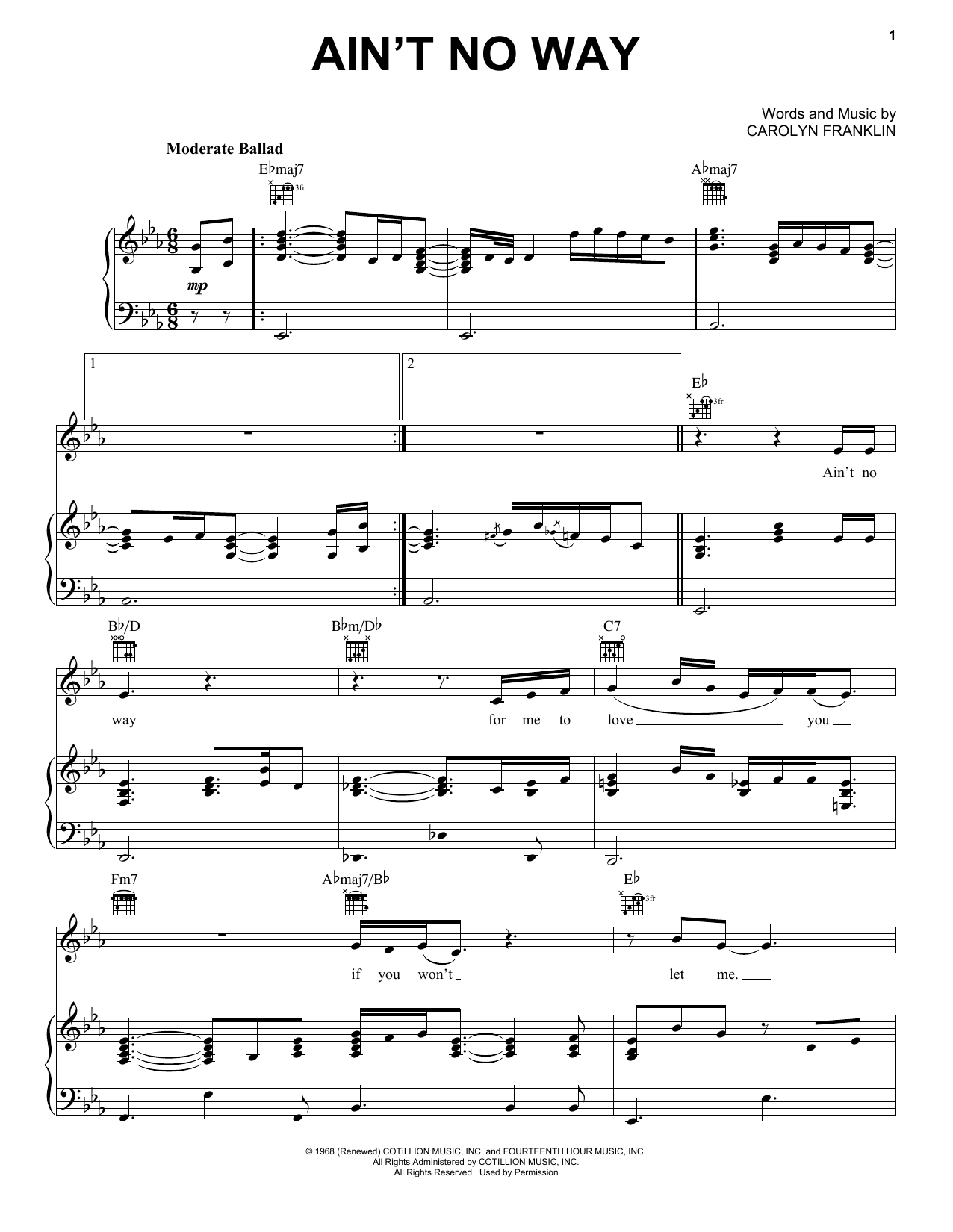 Download or print Aretha Franklin Ain't No Way sheet music, chords and digital score arranged for Piano, Vocal & Guitar Chords (Right-Hand Melody). This Pop score includes 7 page(s).