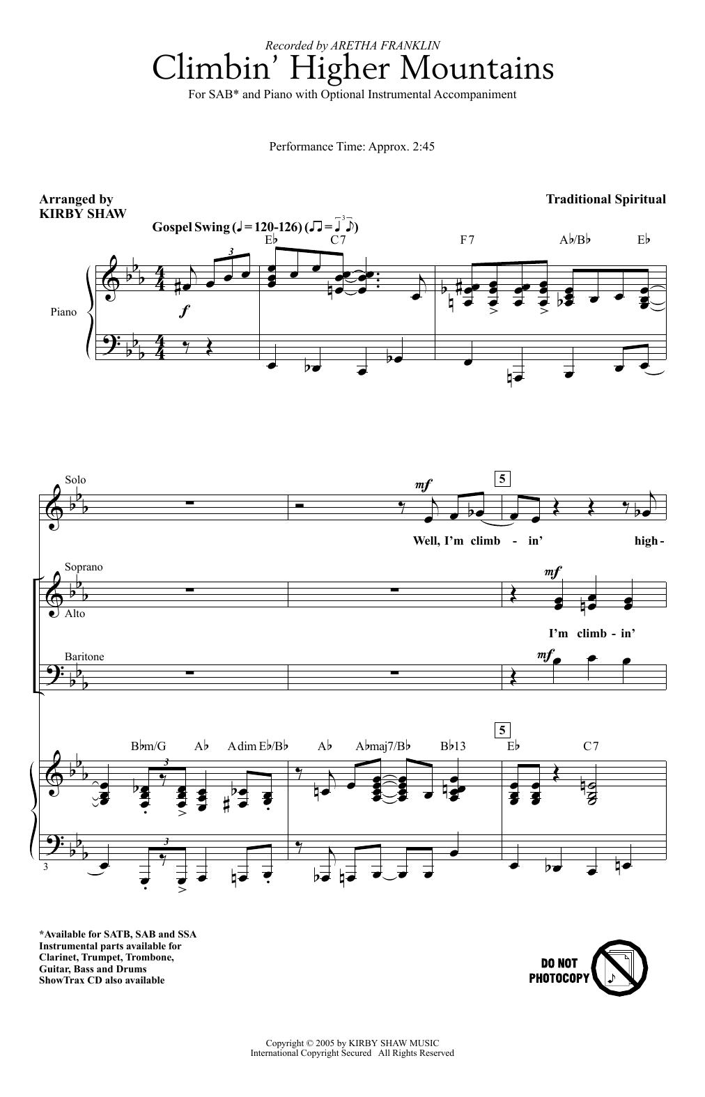 Download or print Aretha Franklin Climbin' Higher Mountains (arr. Kirby Shaw) sheet music, chords and digital score arranged for SAB Choir. This Gospel score includes 11 page(s).
