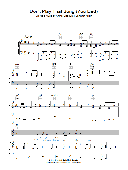 Download or print Aretha Franklin Don't Play That Song (You Lied) sheet music, chords and digital score arranged for Guitar Chords/Lyrics. This Soul score includes 3 page(s).