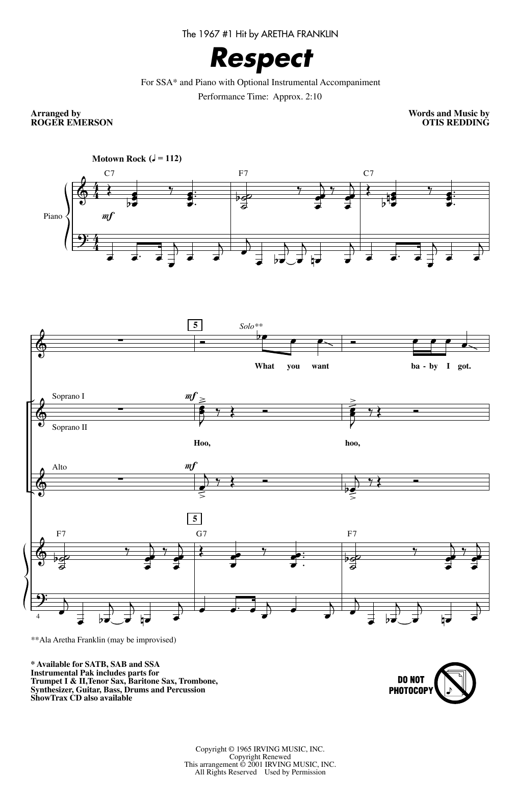 Download or print Aretha Franklin Respect (arr. Roger Emerson) sheet music, chords and digital score arranged for SSA Choir. This Oldies score includes 11 page(s).
