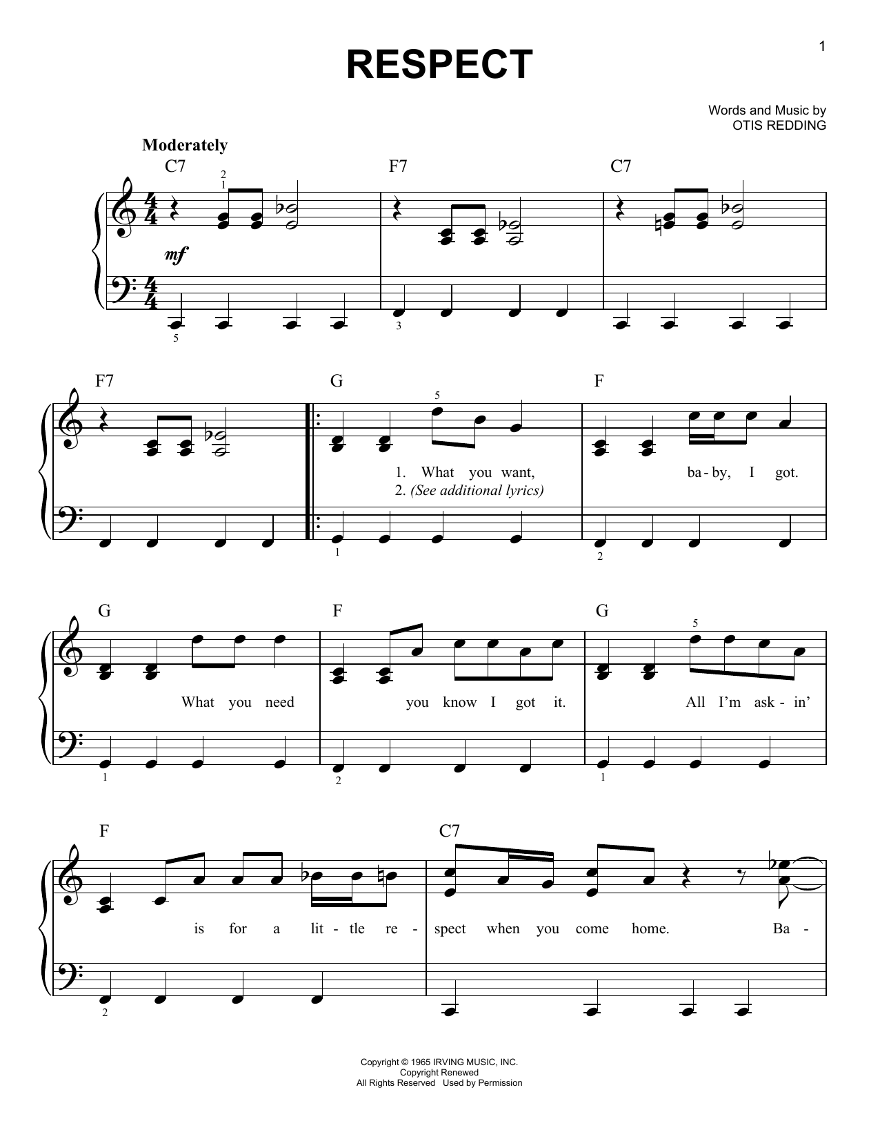 Download or print Aretha Franklin Respect sheet music, chords and digital score arranged for Easy Bass Tab. This Pop score includes 1 page(s).