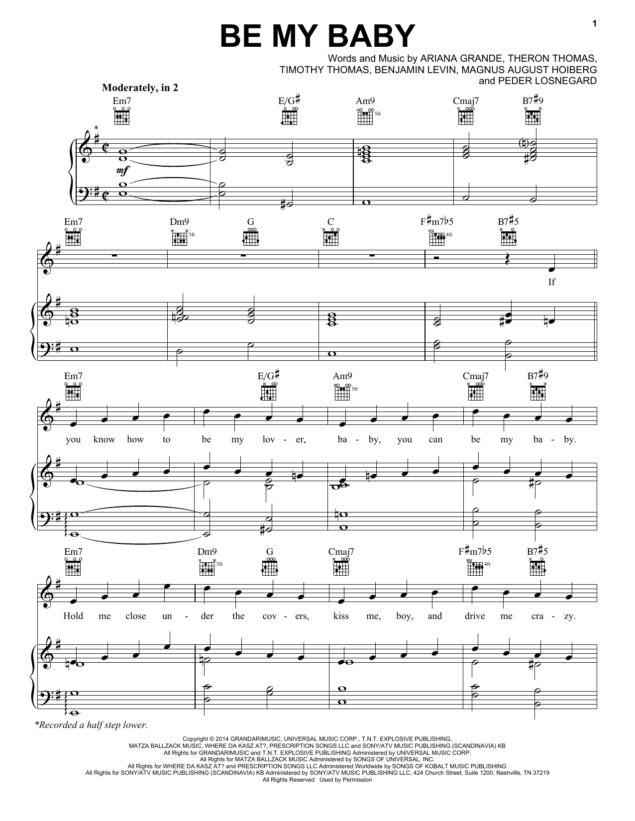 Download or print Ariana Grande Be My Baby sheet music, chords and digital score arranged for Piano, Vocal & Guitar Chords (Right-Hand Melody). This Pop score includes 9 page(s).
