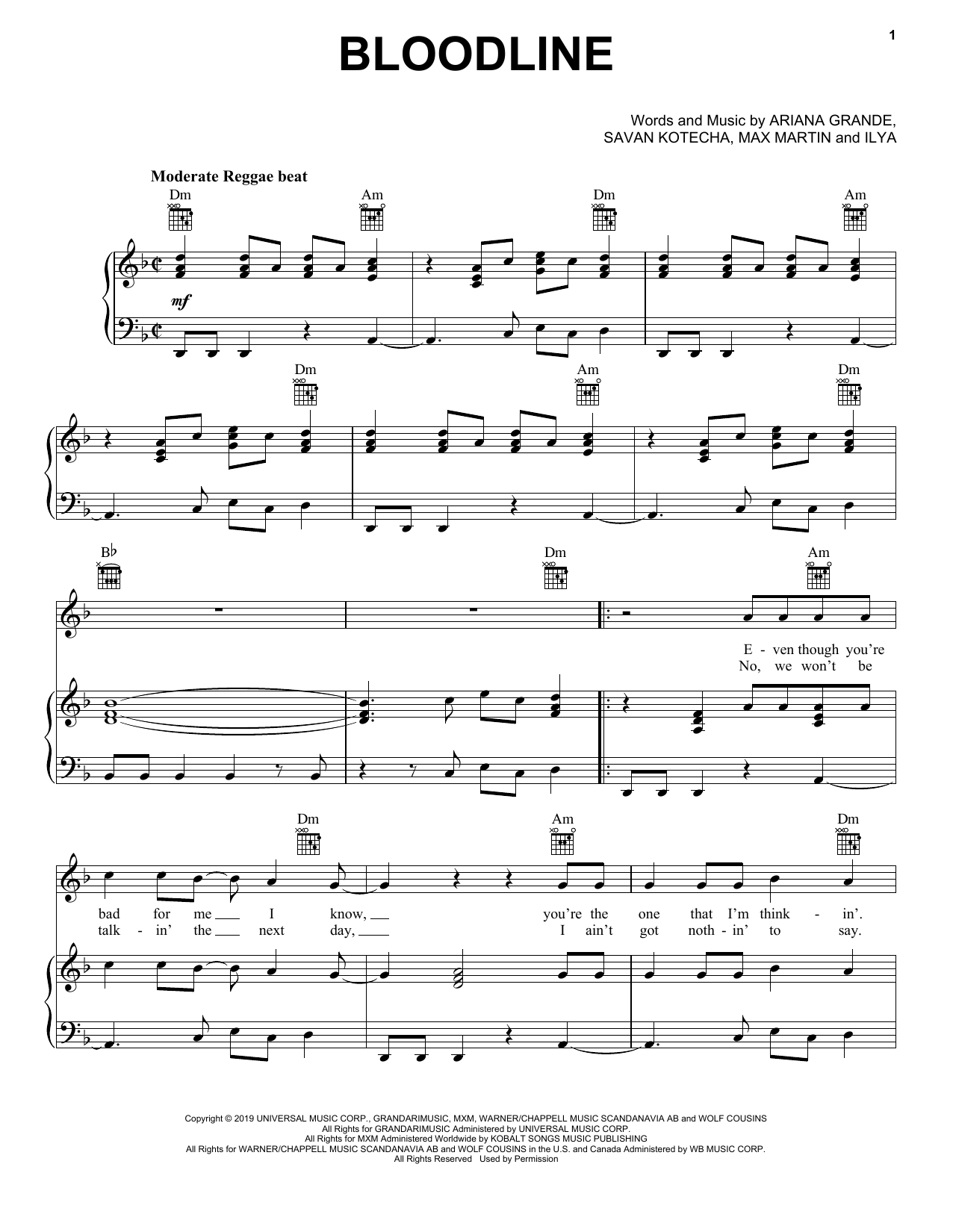Download or print Ariana Grande Bloodline sheet music, chords and digital score arranged for Piano, Vocal & Guitar Chords (Right-Hand Melody). This Pop score includes 6 page(s).
