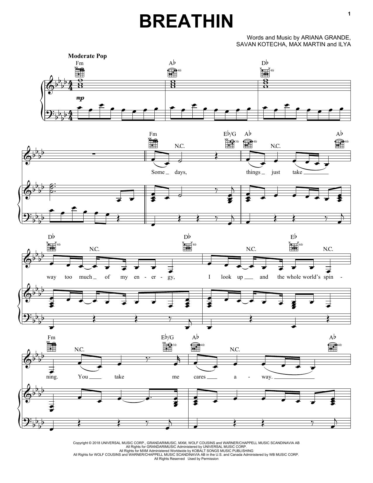Download or print Ariana Grande Breathin sheet music, chords and digital score arranged for Ukulele. This Pop score includes 4 page(s).