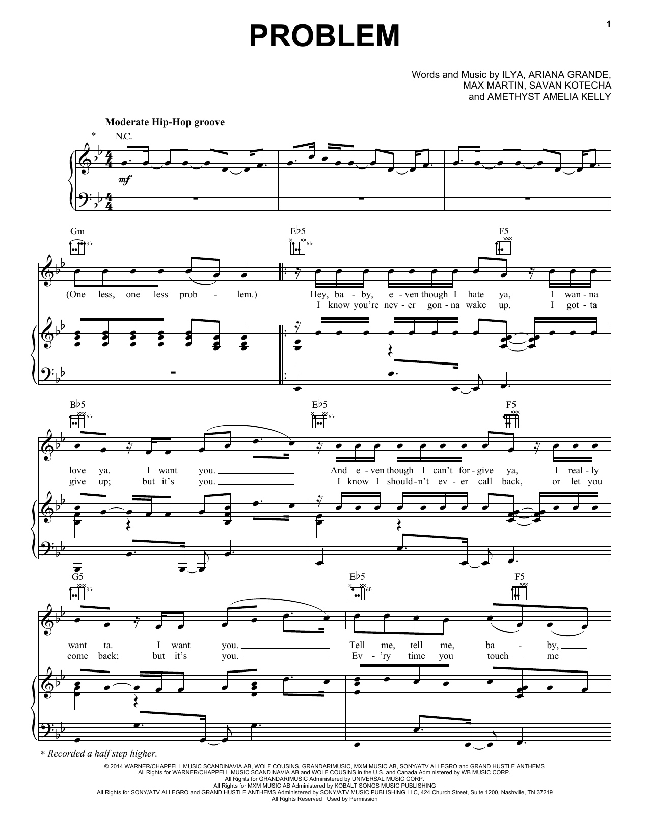 Download or print Ariana Grande Featuring Iggy Azalea Problem sheet music, chords and digital score arranged for Piano, Vocal & Guitar Chords (Right-Hand Melody). This Pop score includes 6 page(s).