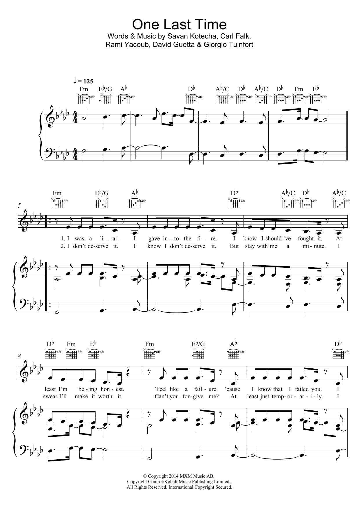 Download or print Ariana Grande One Last Time sheet music, chords and digital score arranged for Easy Piano. This Pop score includes 5 page(s).