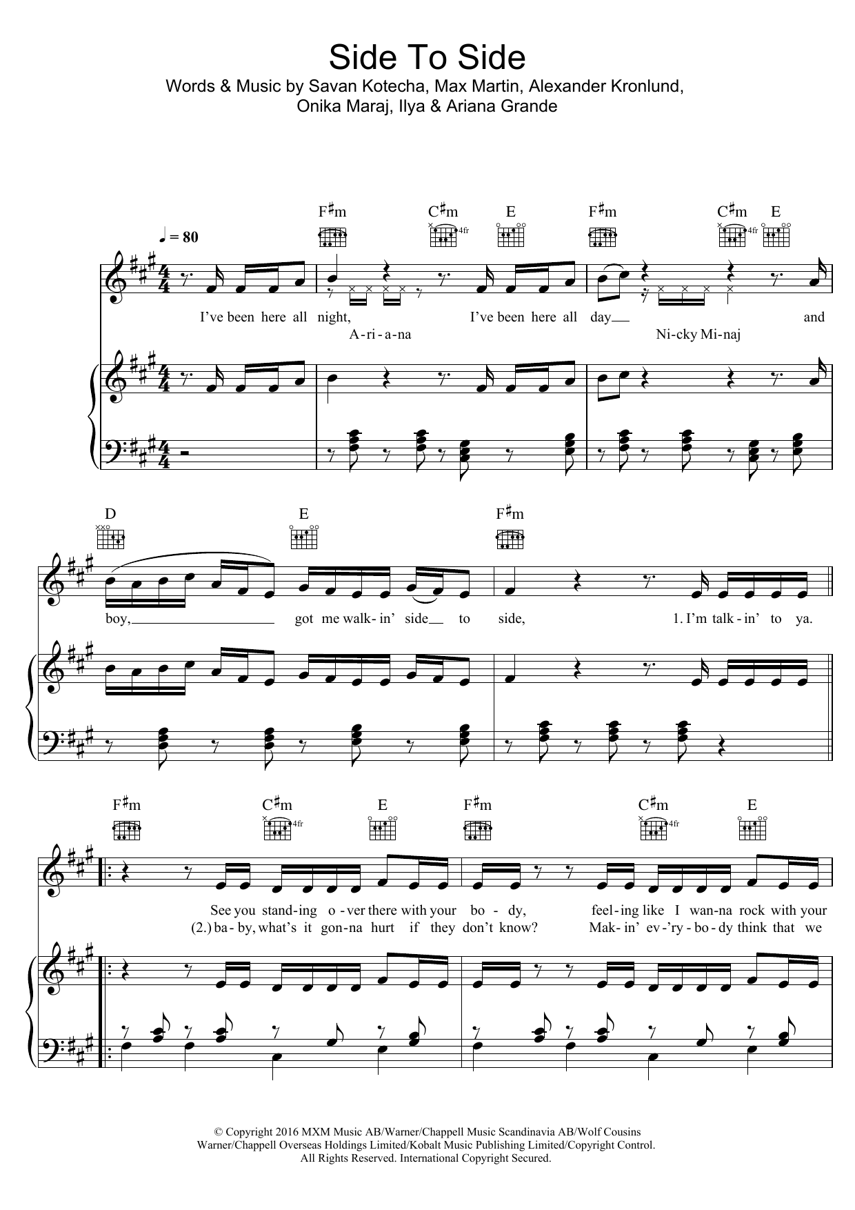Download or print Ariana Grande Side To Side (feat. Nicki Minaj) sheet music, chords and digital score arranged for Easy Piano. This R & B score includes 5 page(s).
