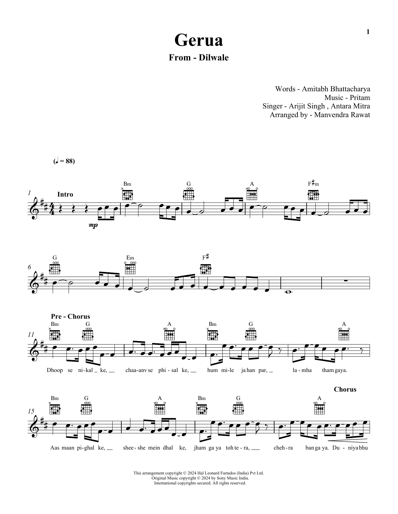 Download or print Arijit Singh & Antara Mitra Gerua (from Dilwale) (2015) sheet music, chords and digital score arranged for Lead Sheet / Fake Book. This Hindi score includes 3 page(s).
