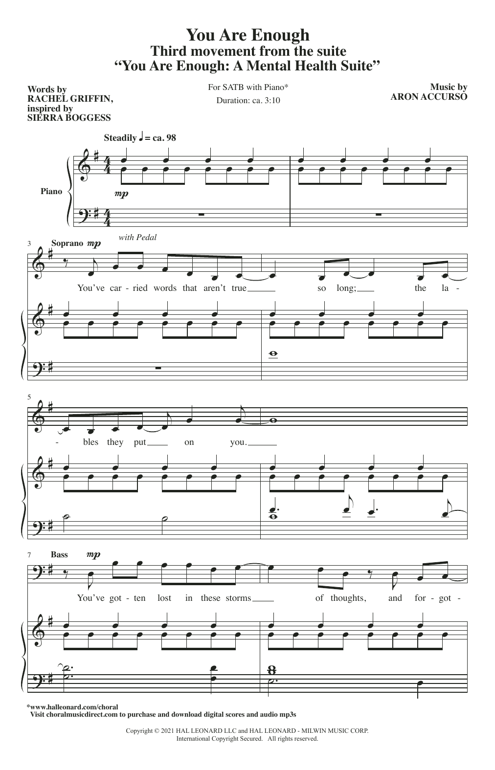 Download or print Aron Accurso and Rachel Griffin Accurso You Are Enough (Third movement from the suite "You Are Enough: A Mental Health Suite") sheet music, chords and digital score arranged for TTBB Choir. This Inspirational score includes 15 page(s).