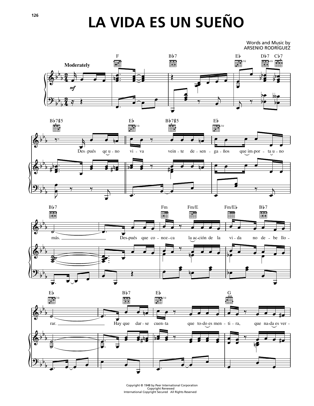 Download or print Arsenio Rodriguez La Vida Es Un Sueno sheet music, chords and digital score arranged for Piano, Vocal & Guitar Chords (Right-Hand Melody). This Latin score includes 2 page(s).
