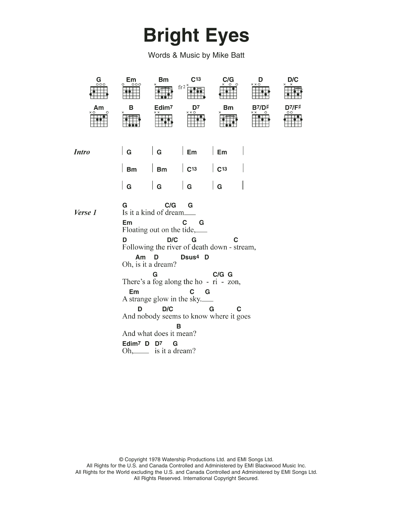 Download or print Art Garfunkel Bright Eyes sheet music, chords and digital score arranged for Guitar Chords/Lyrics. This Pop score includes 2 page(s).