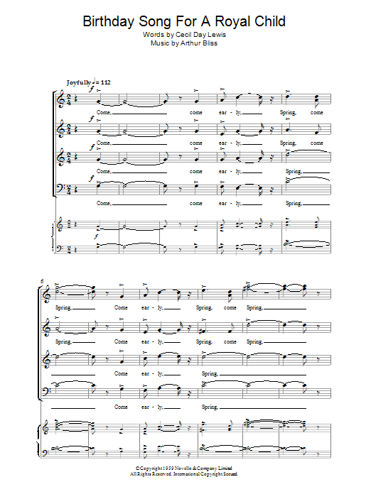 Download or print Arthur Bliss Birthday Song For A Royal Child sheet music, chords and digital score arranged for Choir. This Concert score includes 12 page(s).