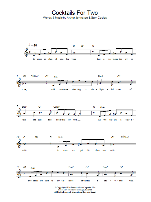 Download or print Arthur Johnston Cocktails For Two sheet music, chords and digital score arranged for Lead Sheet / Fake Book. This Jazz score includes 2 page(s).