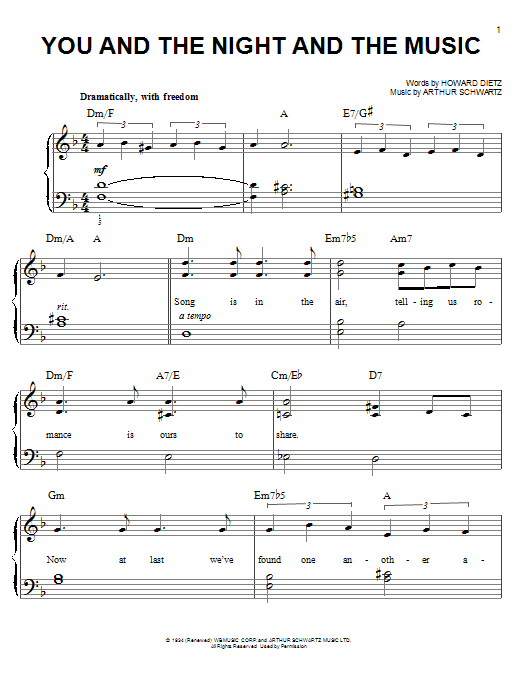 Download or print Arthur Schwartz You And The Night And The Music sheet music, chords and digital score arranged for Easy Piano. This Jazz score includes 5 page(s).