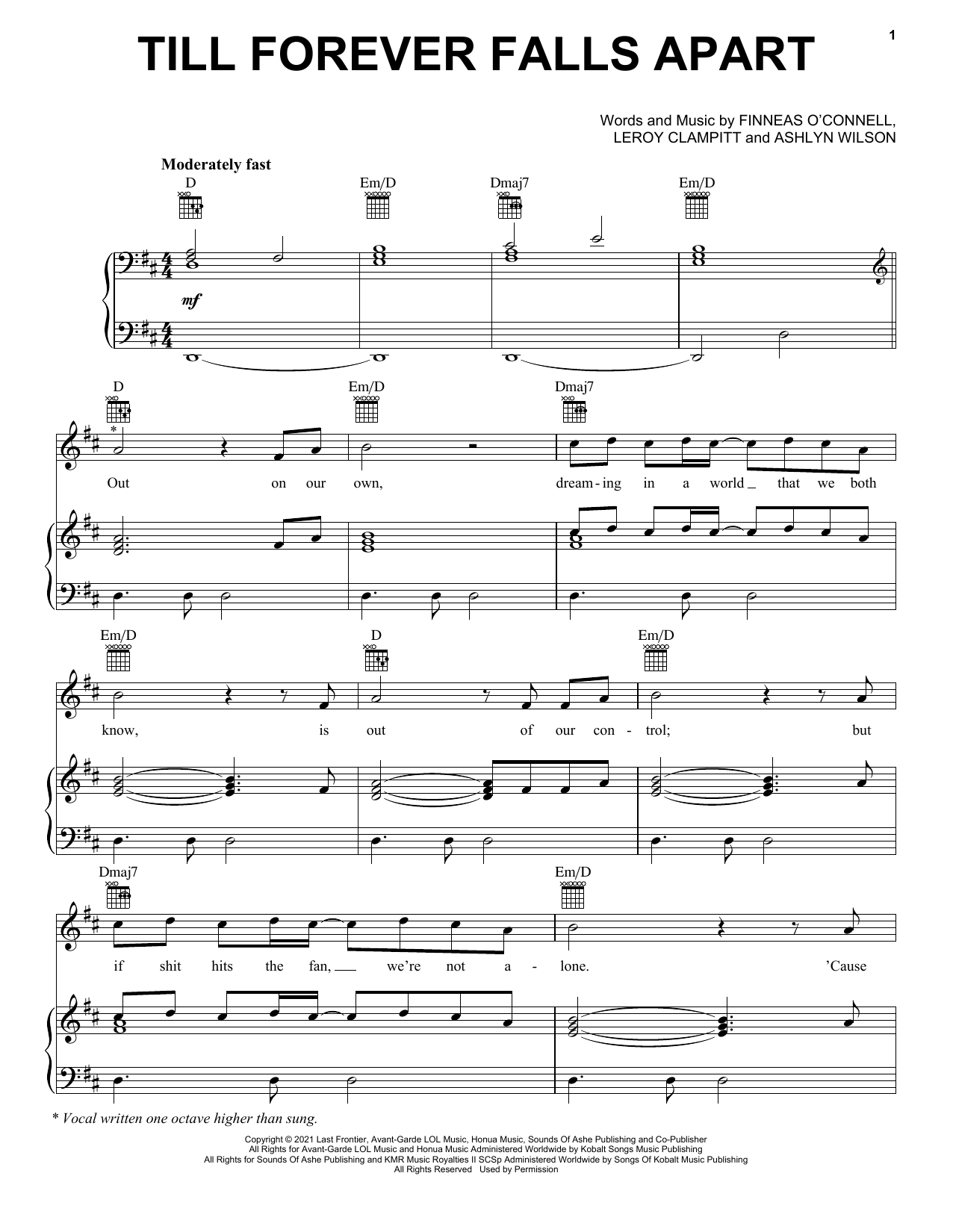 Download or print Ashe & FINNEAS Till Forever Falls Apart sheet music, chords and digital score arranged for Piano, Vocal & Guitar Chords (Right-Hand Melody). This Pop score includes 6 page(s).