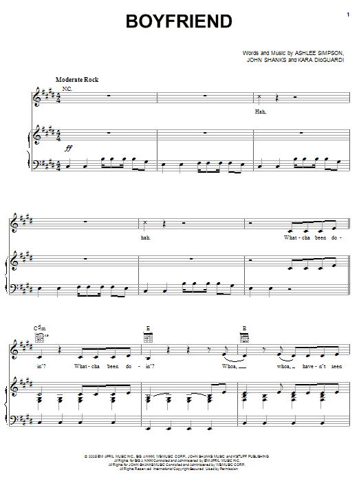 Download or print Ashlee Simpson Boyfriend sheet music, chords and digital score arranged for Piano, Vocal & Guitar Chords (Right-Hand Melody). This Pop score includes 7 page(s).