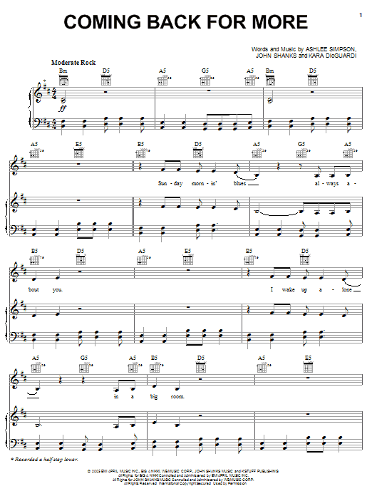 Download or print Ashlee Simpson Coming Back For More sheet music, chords and digital score arranged for Piano, Vocal & Guitar Chords (Right-Hand Melody). This Pop score includes 8 page(s).
