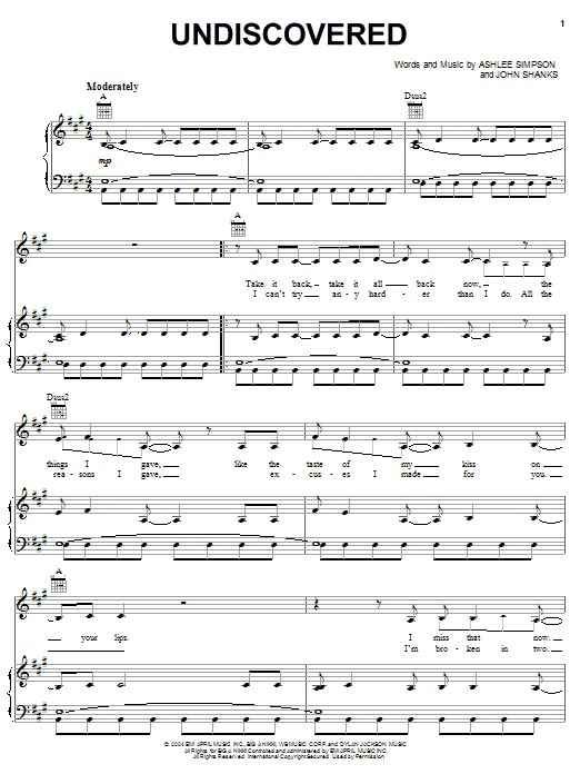 Download or print Ashlee Simpson Undiscovered sheet music, chords and digital score arranged for Piano, Vocal & Guitar Chords (Right-Hand Melody). This Pop score includes 9 page(s).