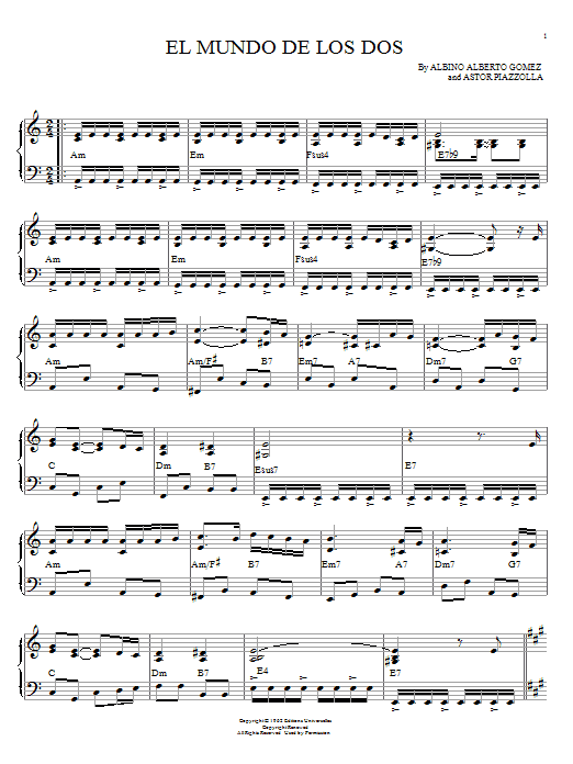Download or print Astor Piazzolla El mundo de los dos sheet music, chords and digital score arranged for Piano Solo. This Jazz score includes 2 page(s).