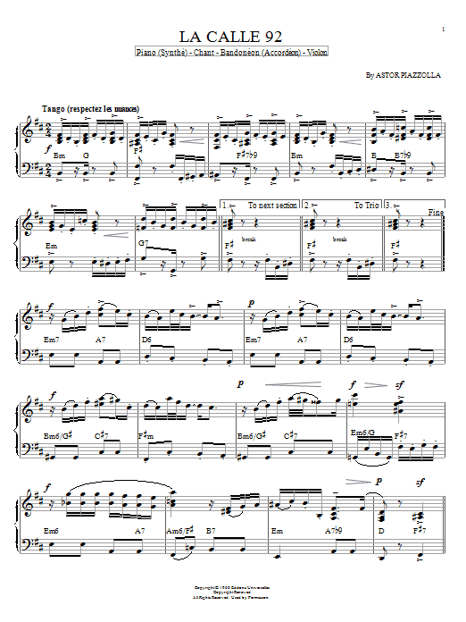 Download or print Astor Piazzolla La Calle 92 sheet music, chords and digital score arranged for Piano Solo. This Jazz score includes 2 page(s).