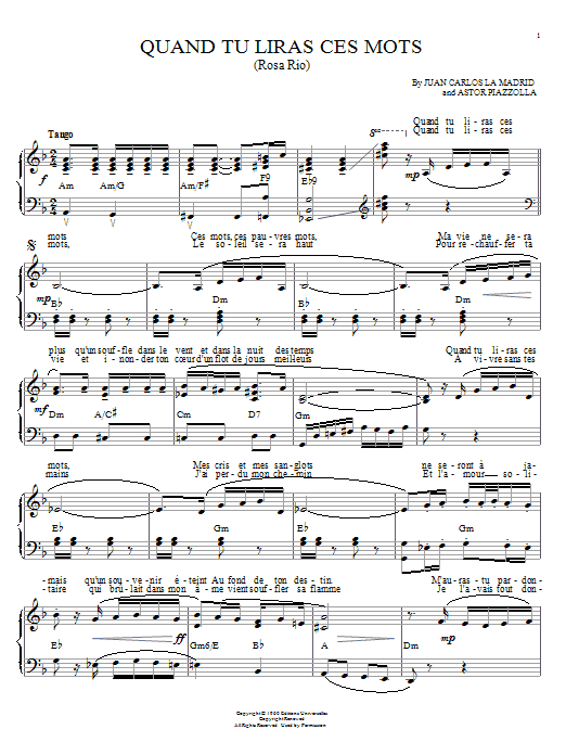 Download or print Astor Piazzolla Quand tu liras ces mots (Rosa Rio) sheet music, chords and digital score arranged for Piano Solo. This Jazz score includes 2 page(s).