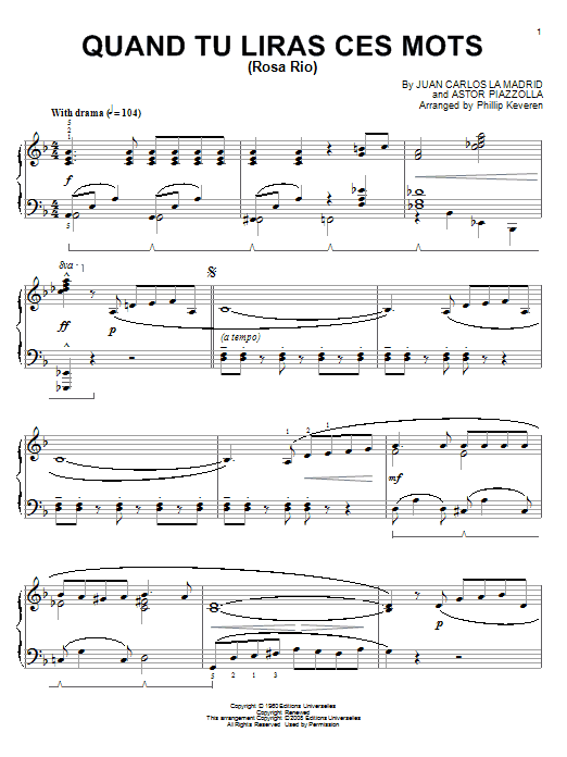 Download or print Astor Piazzolla Quand tu liras ces mots (Rosa Rio) (arr. Phillip Keveren) sheet music, chords and digital score arranged for Piano Solo. This Latin score includes 3 page(s).