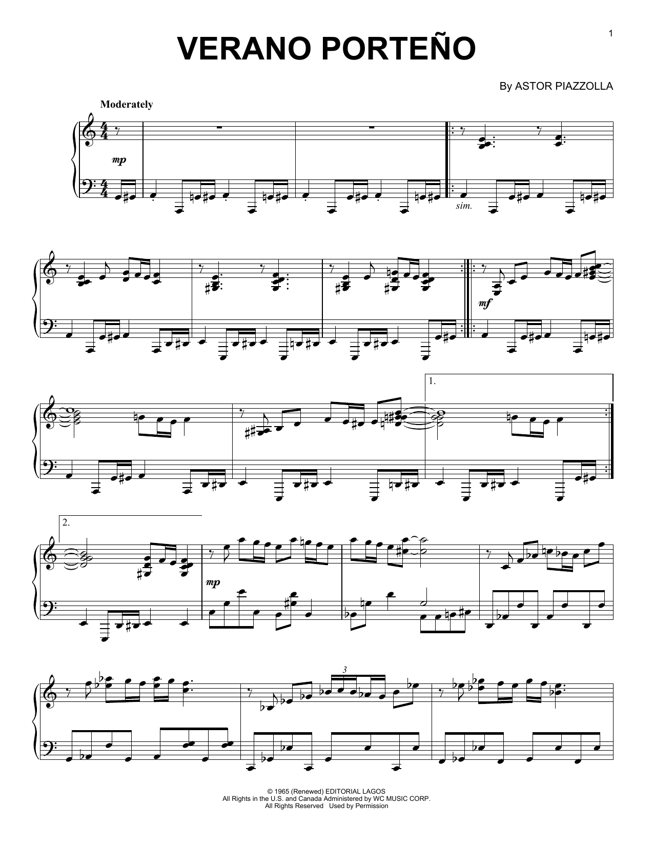 Download or print Astor Piazzolla Verano Porteno sheet music, chords and digital score arranged for Piano Solo. This Latin score includes 8 page(s).