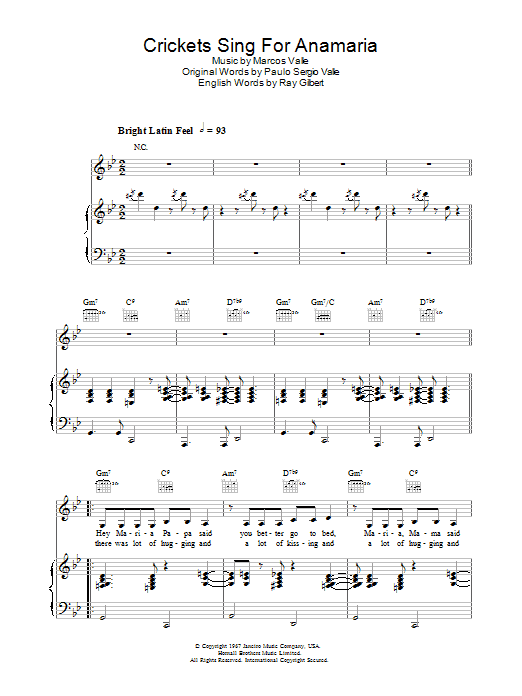 Download or print Astrud Gilberto Crickets Sing For Anamaria sheet music, chords and digital score arranged for Piano, Vocal & Guitar Chords. This Jazz score includes 4 page(s).