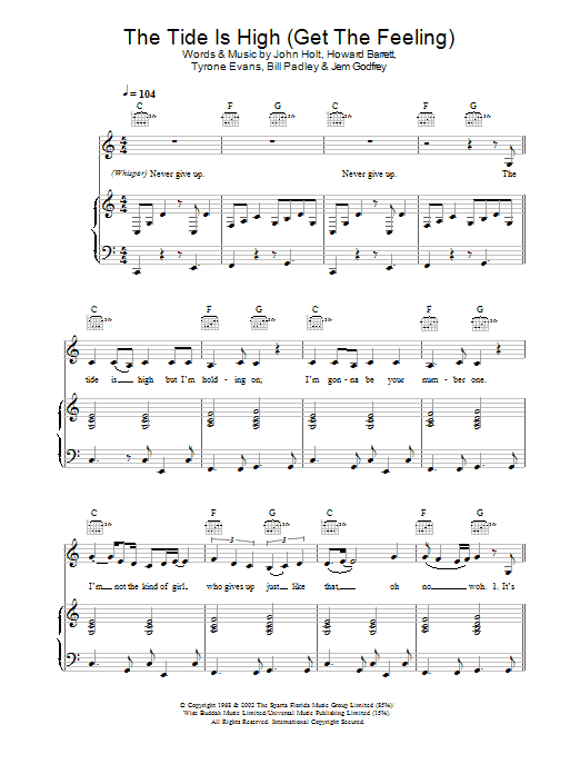 Download or print Atomic Kitten The Tide Is High (Get The Feeling) sheet music, chords and digital score arranged for Piano Chords/Lyrics. This Pop score includes 2 page(s).