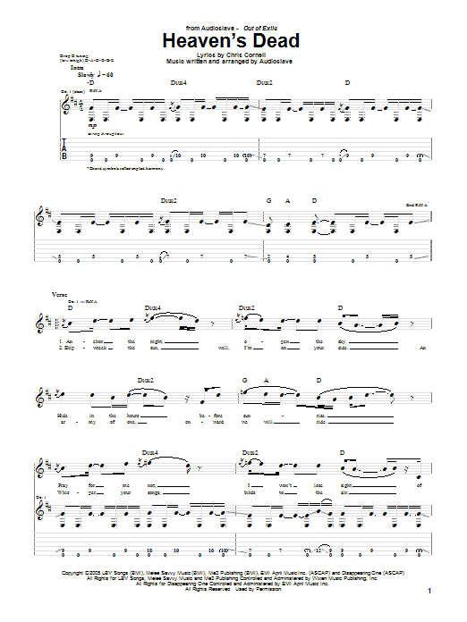 Download or print Audioslave Heaven's Dead sheet music, chords and digital score arranged for Guitar Tab. This Metal score includes 5 page(s).