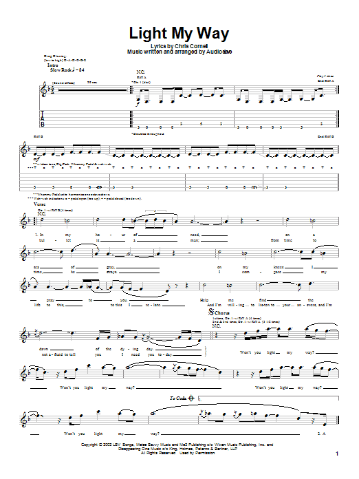 Download or print Audioslave Light My Way sheet music, chords and digital score arranged for Guitar Tab. This Alternative score includes 3 page(s).