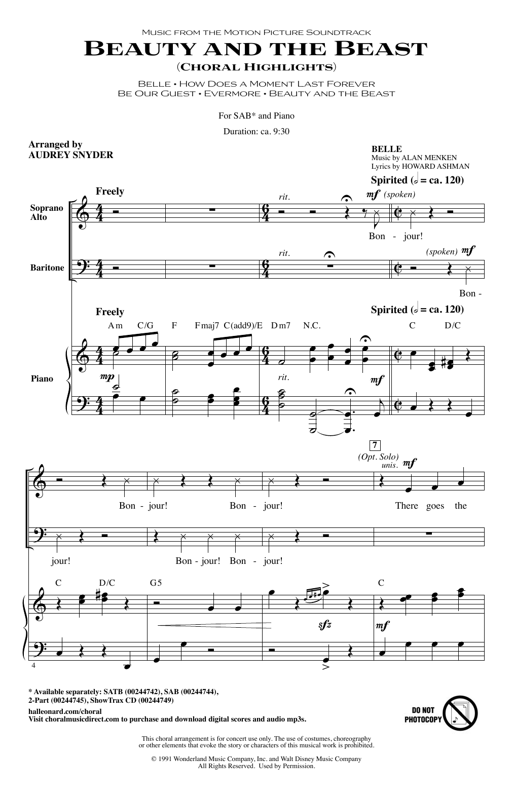 Download or print Audrey Snyder Beauty and The Beast (Choral Highlights) sheet music, chords and digital score arranged for SAB Choir. This Children score includes 31 page(s).