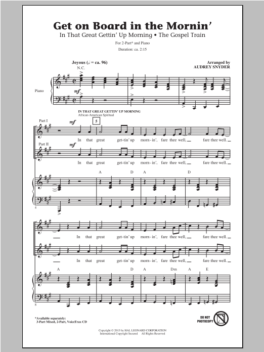 Download or print Audrey Snyder Get On Board In The Mornin' sheet music, chords and digital score arranged for 3-Part Mixed Choir. This Concert score includes 13 page(s).