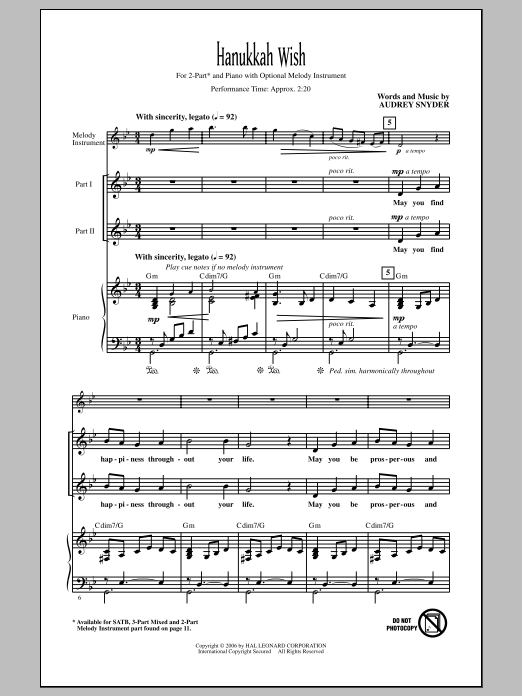Download or print Audrey Snyder Hanukkah Wish sheet music, chords and digital score arranged for 3-Part Mixed Choir. This Concert score includes 10 page(s).