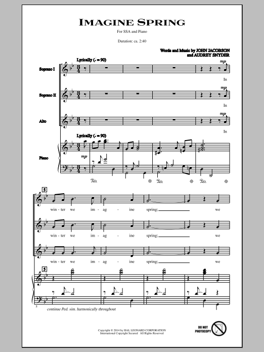 Download or print Audrey Snyder Imagine Spring sheet music, chords and digital score arranged for SSA Choir. This Concert score includes 2 page(s).