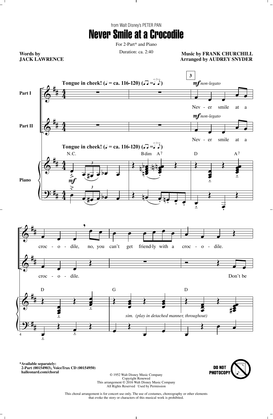 Download or print Audrey Snyder Never Smile At A Crocodile sheet music, chords and digital score arranged for 2-Part Choir. This Children score includes 9 page(s).