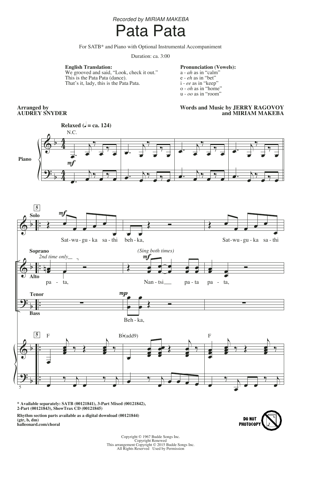 Download or print Audrey Snyder Pata Pata sheet music, chords and digital score arranged for 3-Part Mixed Choir. This Pop score includes 11 page(s).