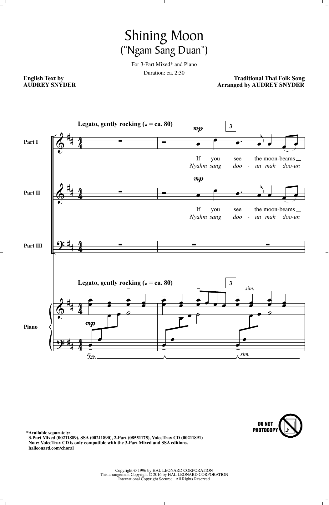 Download or print Audrey Snyder Shining Moon (Ngam Sang Duan) sheet music, chords and digital score arranged for SSA Choir. This Multicultural score includes 10 page(s).