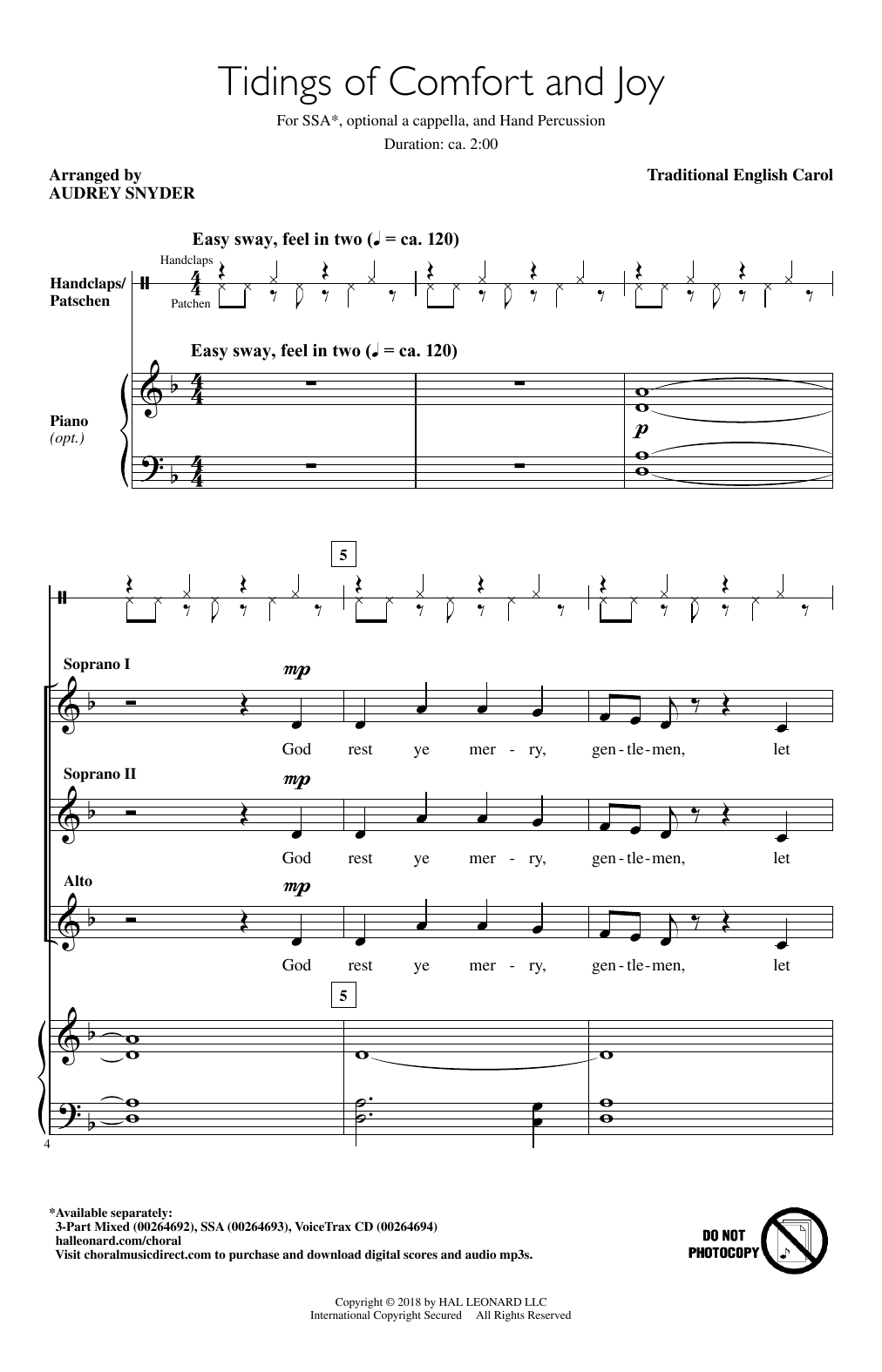 Download or print Audrey Snyder Tidings Of Comfort And Joy sheet music, chords and digital score arranged for 3-Part Mixed Choir. This Christmas score includes 10 page(s).