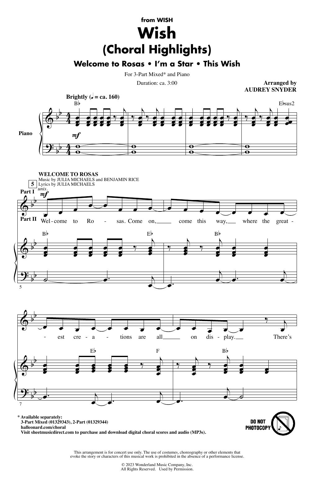 Download or print Audrey Snyder Wish (Choral Highlights) sheet music, chords and digital score arranged for 3-Part Mixed Choir. This Disney score includes 14 page(s).
