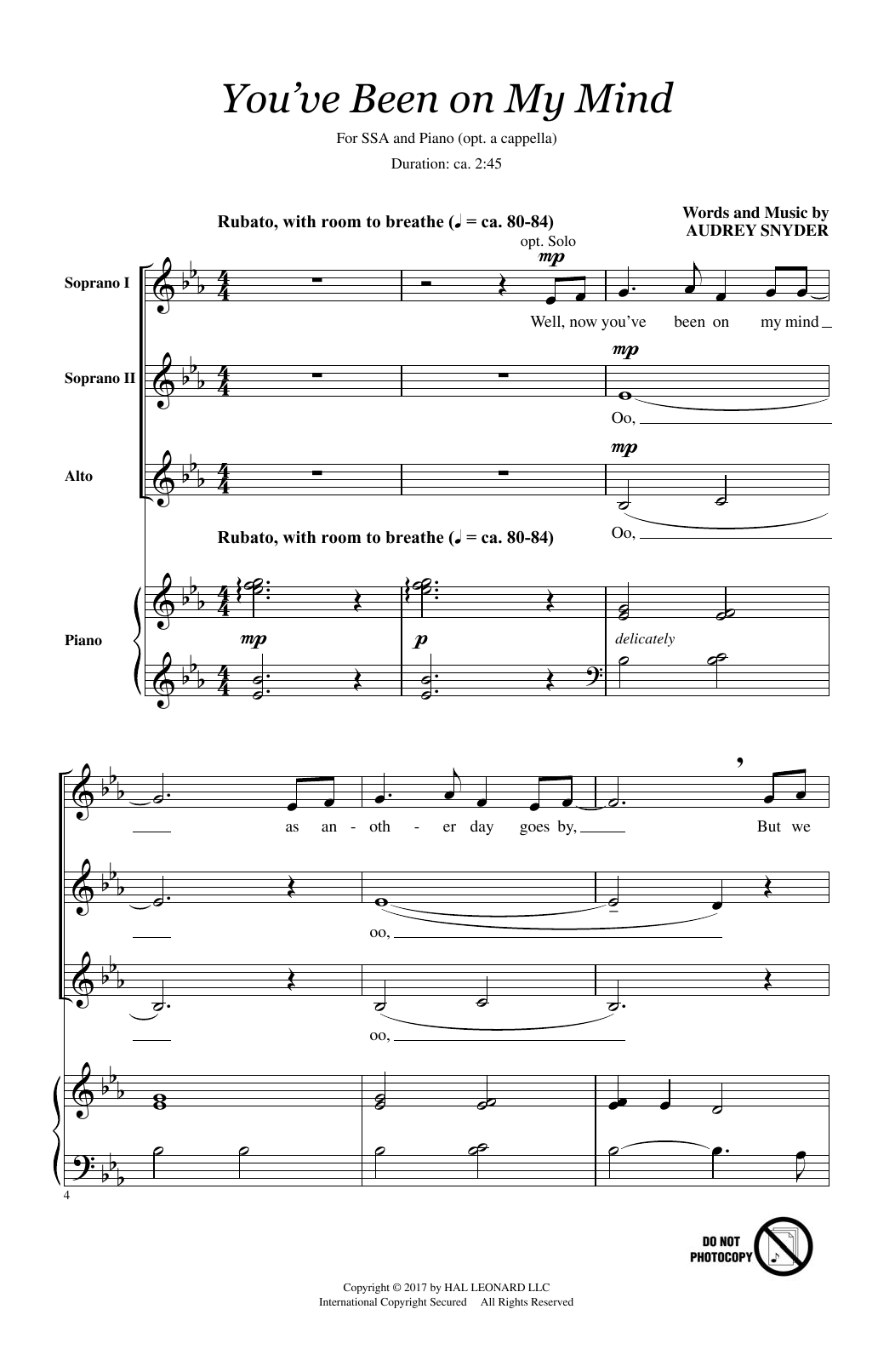 Download or print Audrey Snyder You've Been On My Mind sheet music, chords and digital score arranged for SATB Choir. This Concert score includes 9 page(s).
