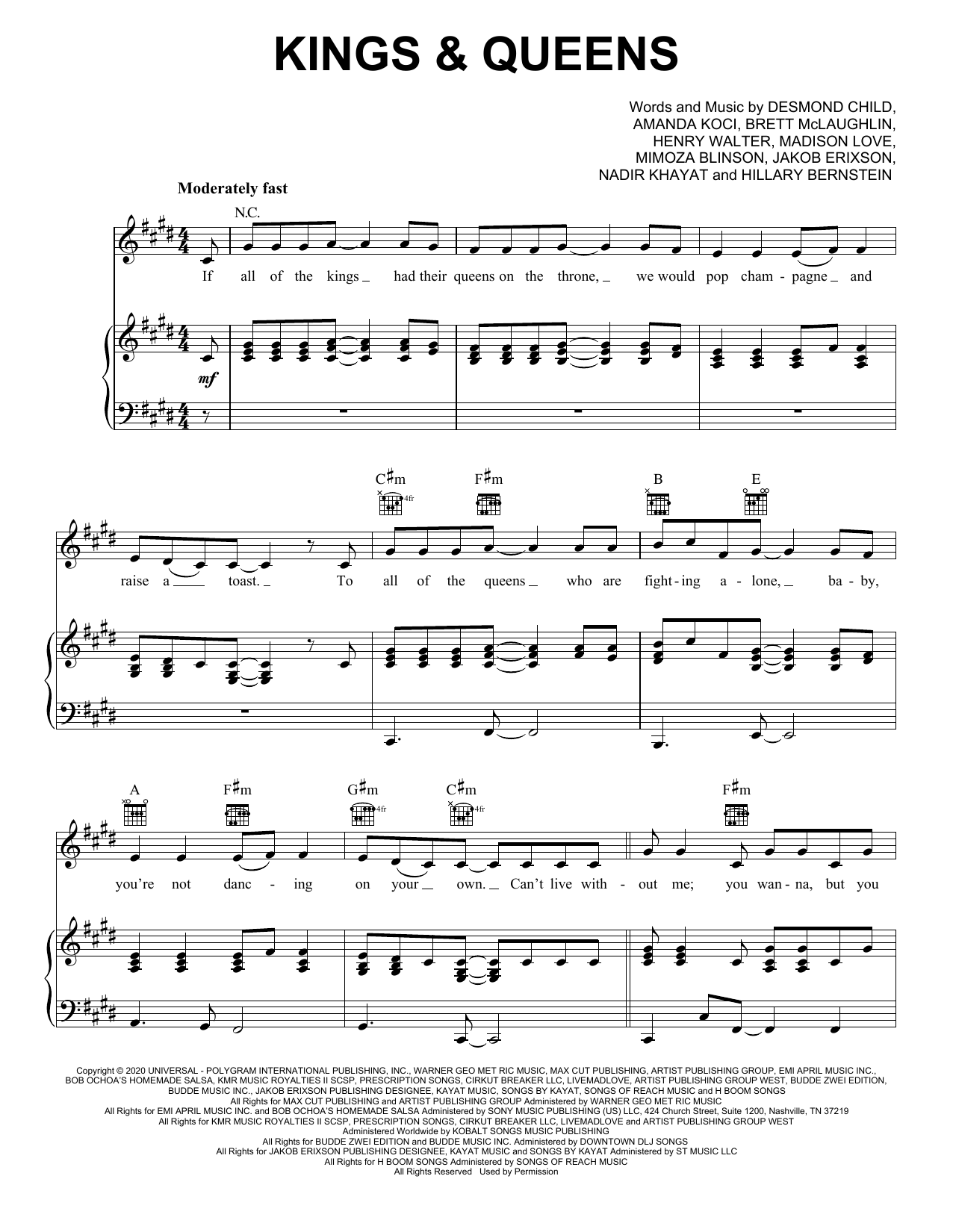 Download or print Ava Max Kings & Queens sheet music, chords and digital score arranged for Tenor Sax Solo. This Pop score includes 2 page(s).