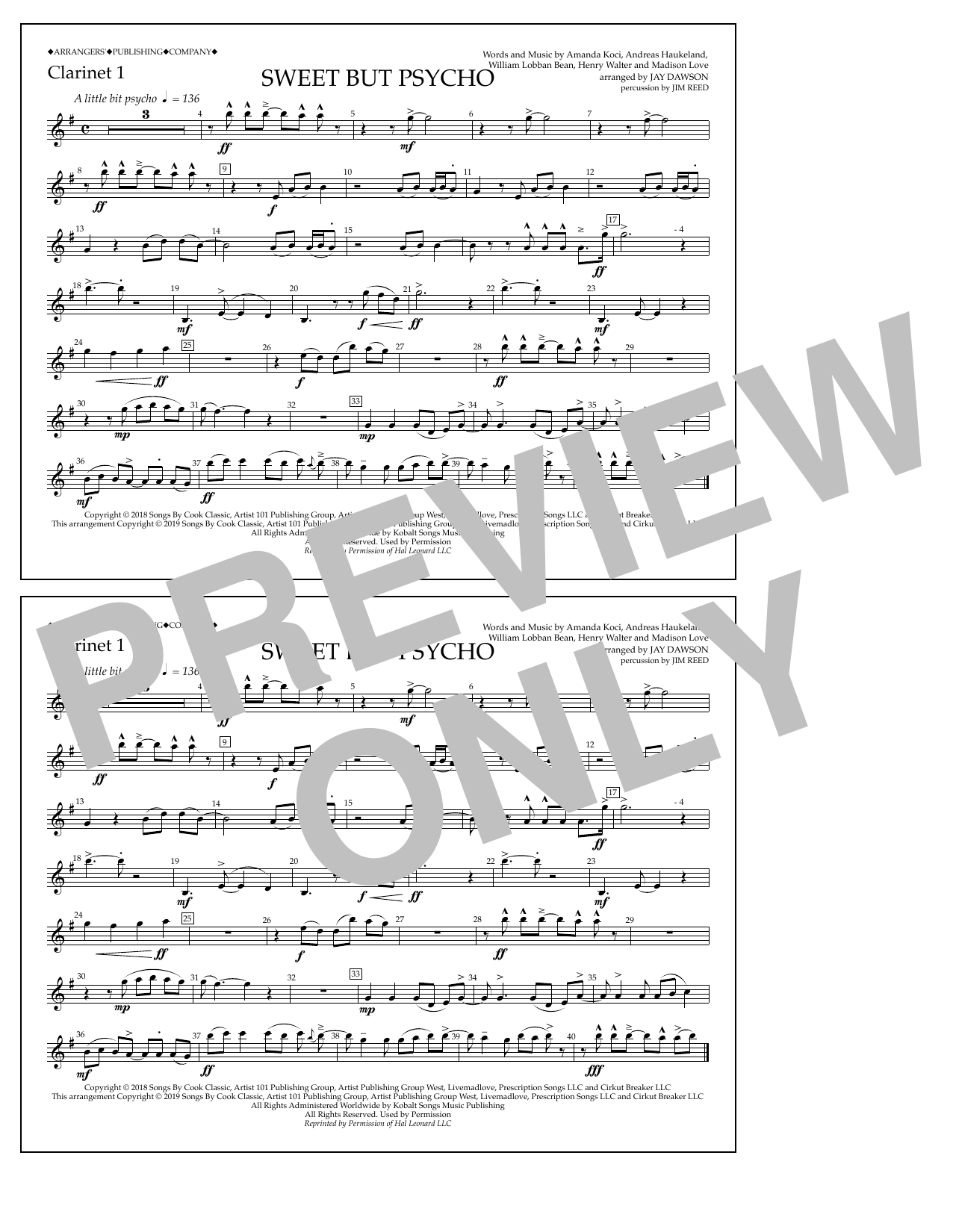 Download or print Ava Max Sweet But Psycho (arr. Jay Dawson) - Clarinet 1 sheet music, chords and digital score arranged for Marching Band. This Pop score includes 1 page(s).