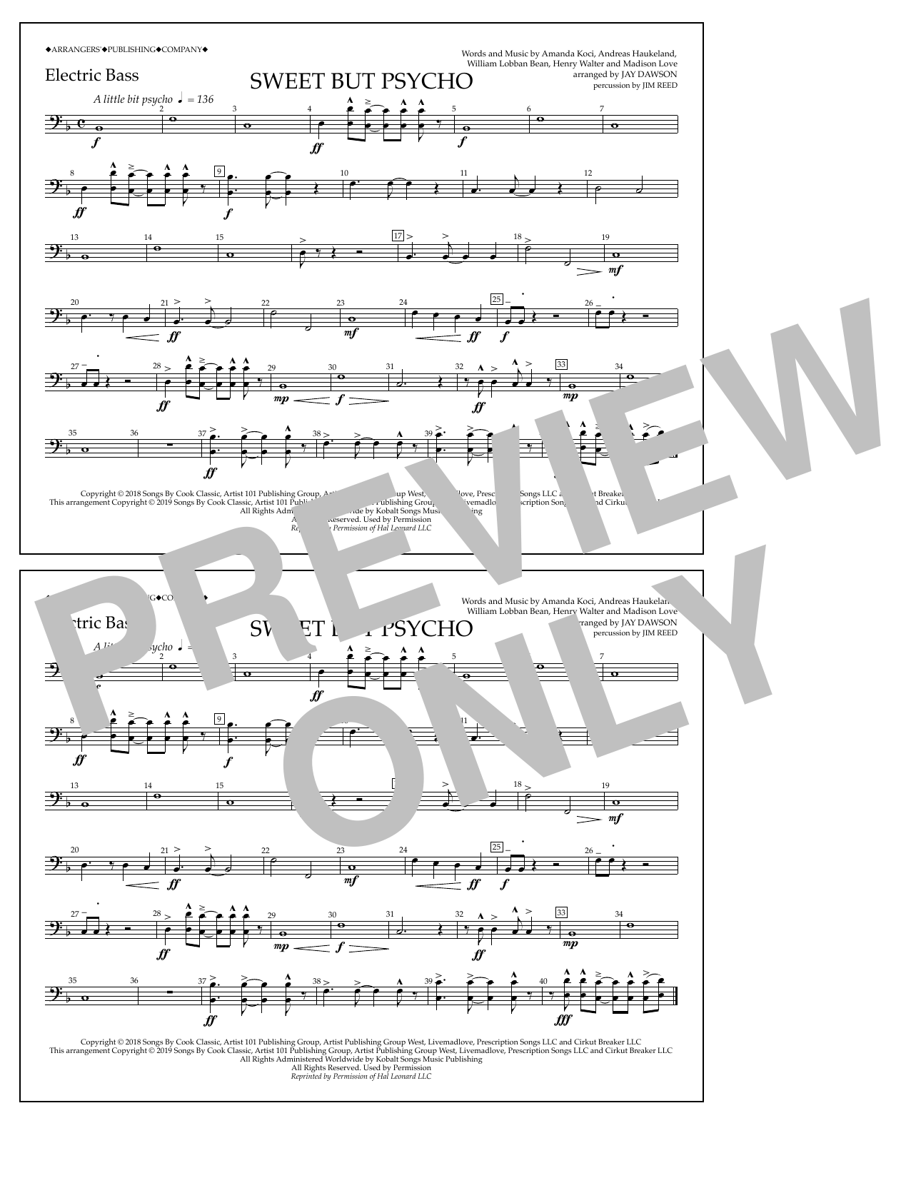 Download or print Ava Max Sweet But Psycho (arr. Jay Dawson) - Electric Bass sheet music, chords and digital score arranged for Marching Band. This Pop score includes 1 page(s).