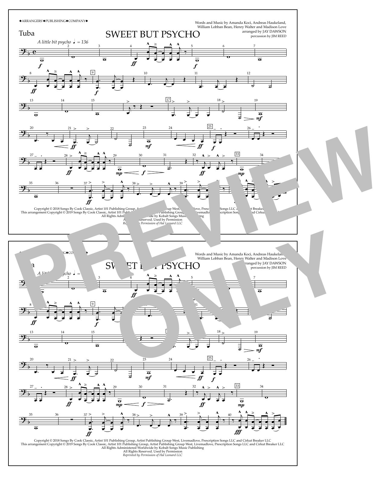 Download or print Ava Max Sweet But Psycho (arr. Jay Dawson) - Tuba sheet music, chords and digital score arranged for Marching Band. This Pop score includes 1 page(s).