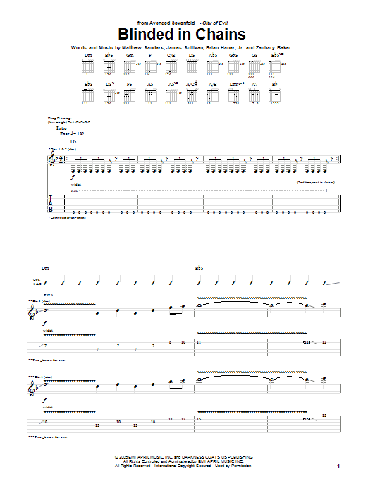 Download or print Avenged Sevenfold Blinded In Chains sheet music, chords and digital score arranged for Guitar Tab. This Metal score includes 23 page(s).