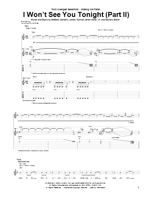 Download or print Avenged Sevenfold I Won't See You Tonight (Part II) sheet music, chords and digital score arranged for Guitar Tab. This Pop score includes 11 page(s).
