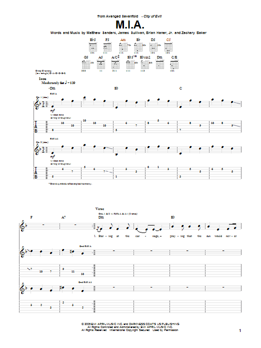 Download or print Avenged Sevenfold M.I.A. sheet music, chords and digital score arranged for Guitar Tab. This Metal score includes 24 page(s).
